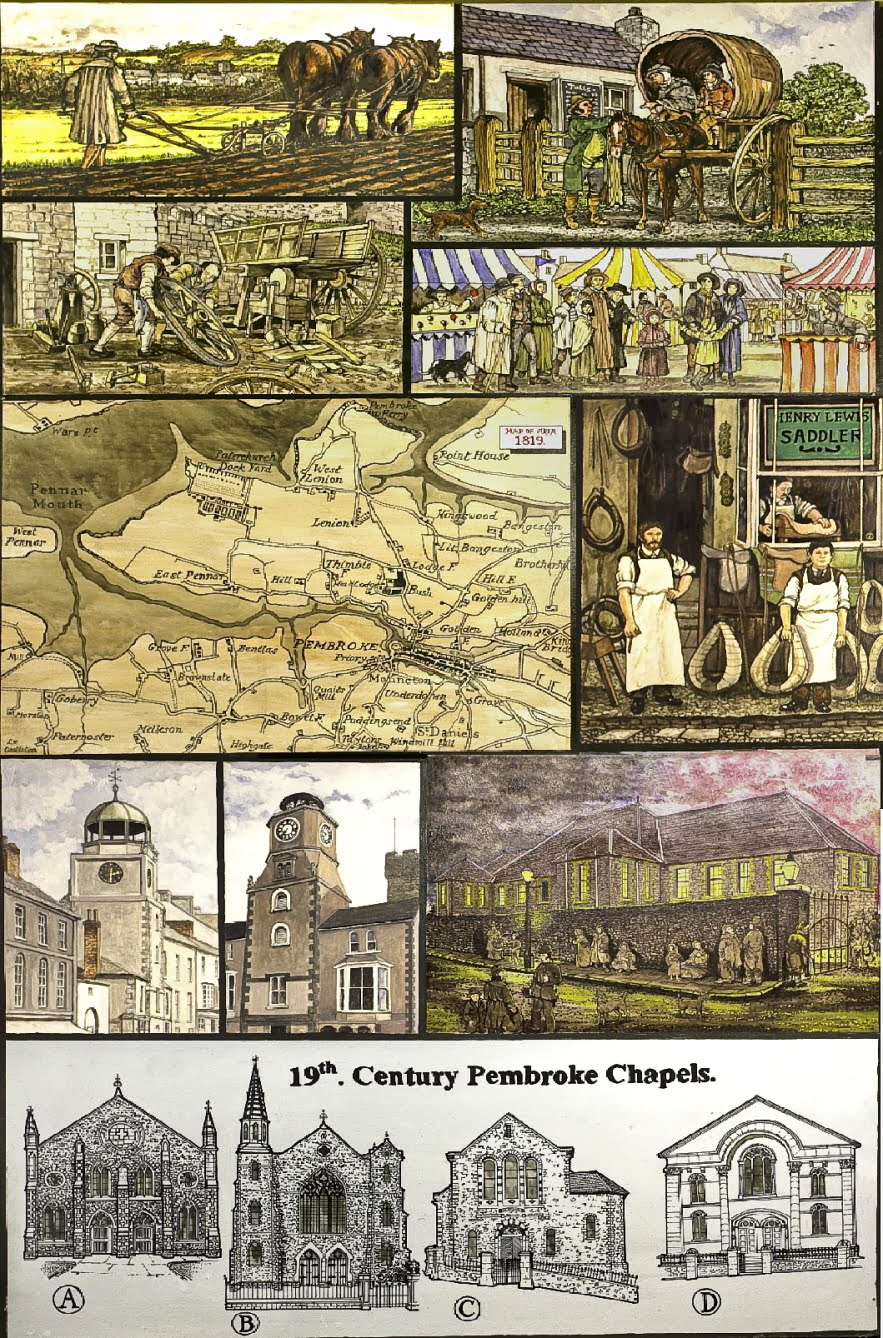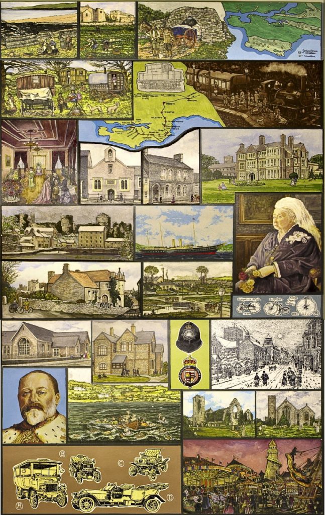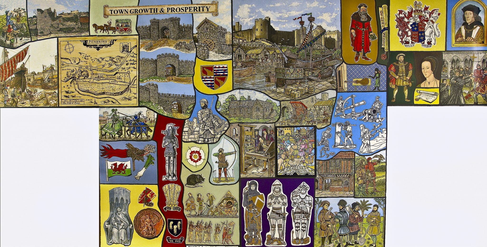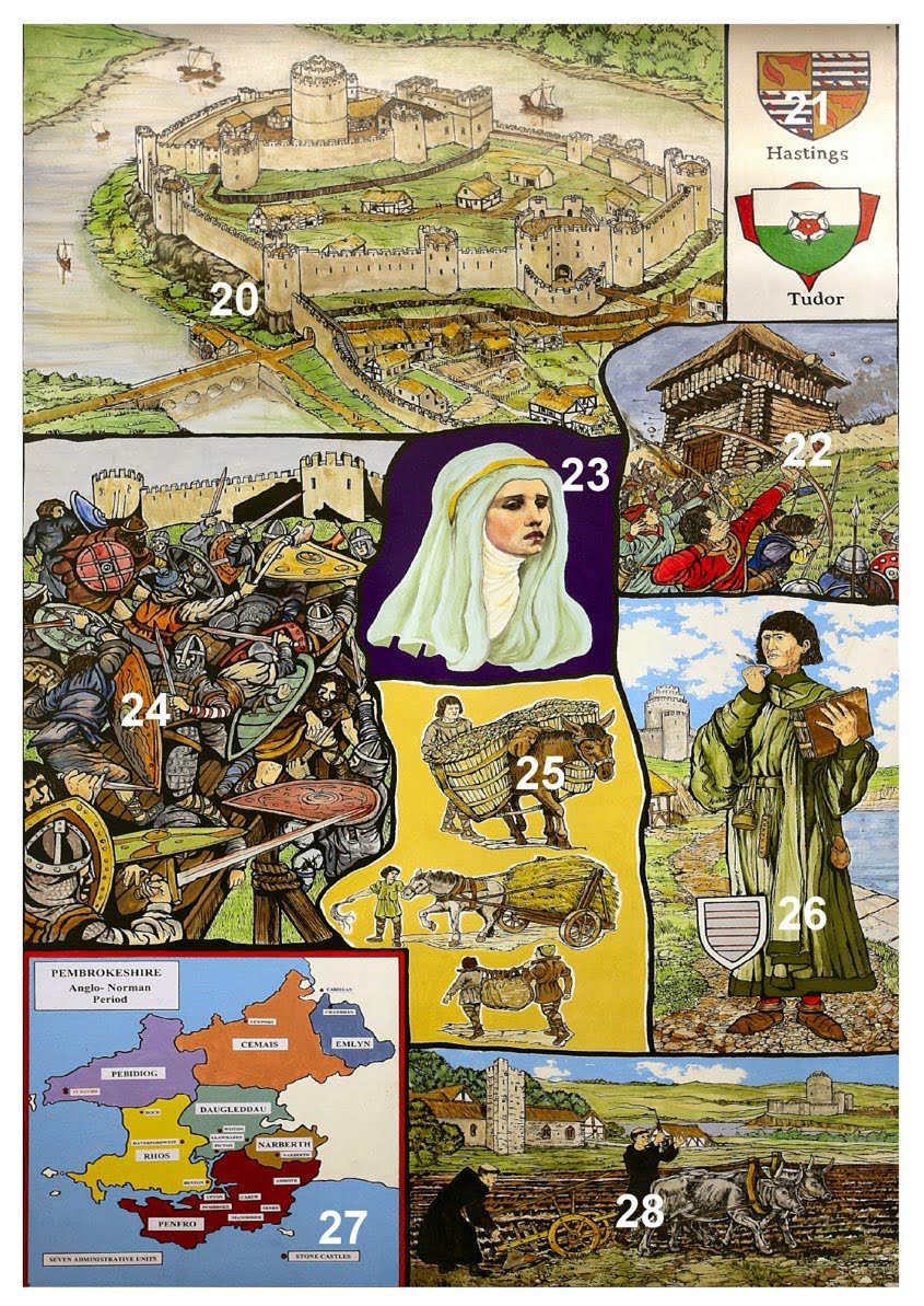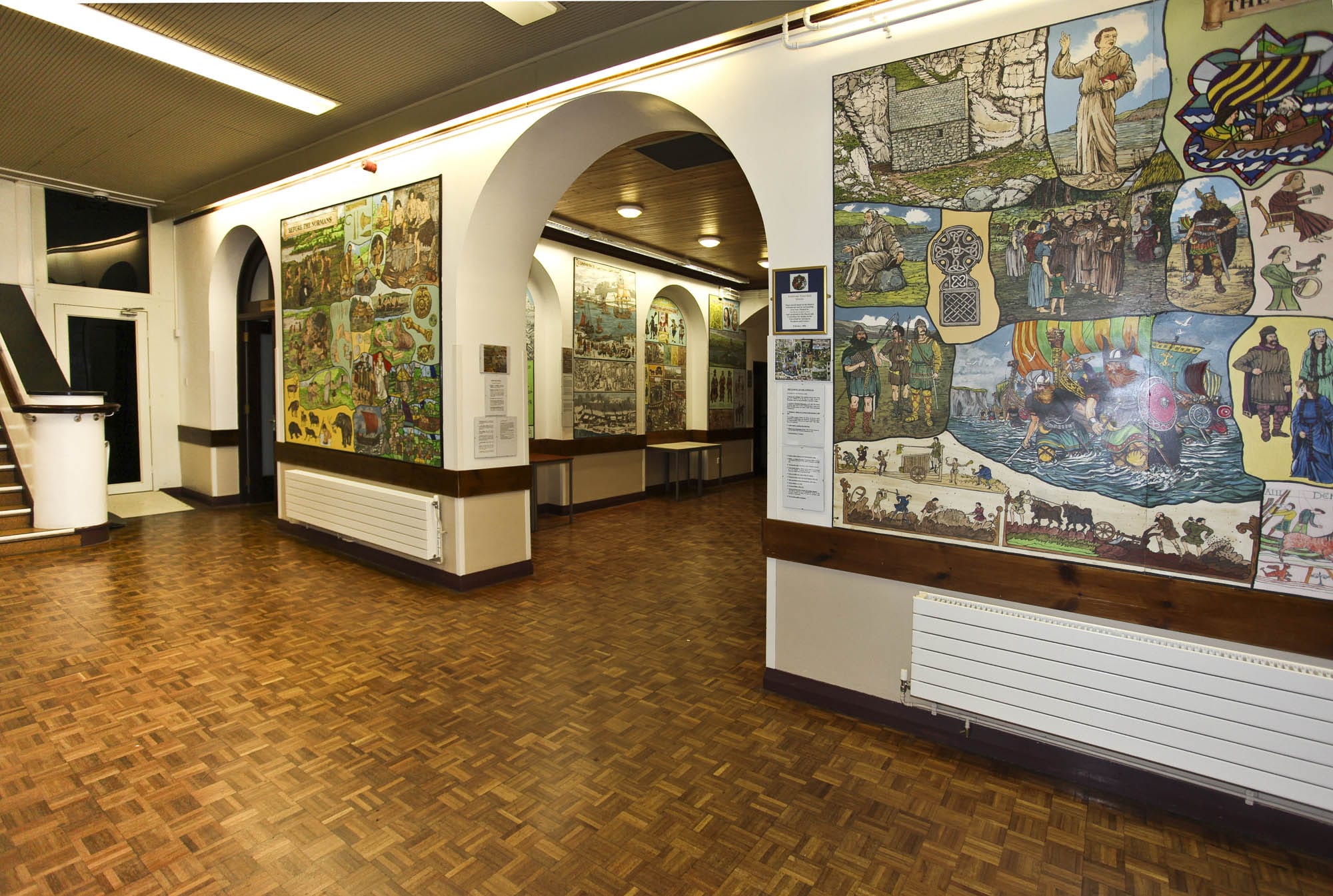 The Murals depict notable events, scenes and people in Pembroke during its development and history from the Stone Age to early 20th Century, are on permanent display in the foyer and upper landing of Pembroke Town Hall.
