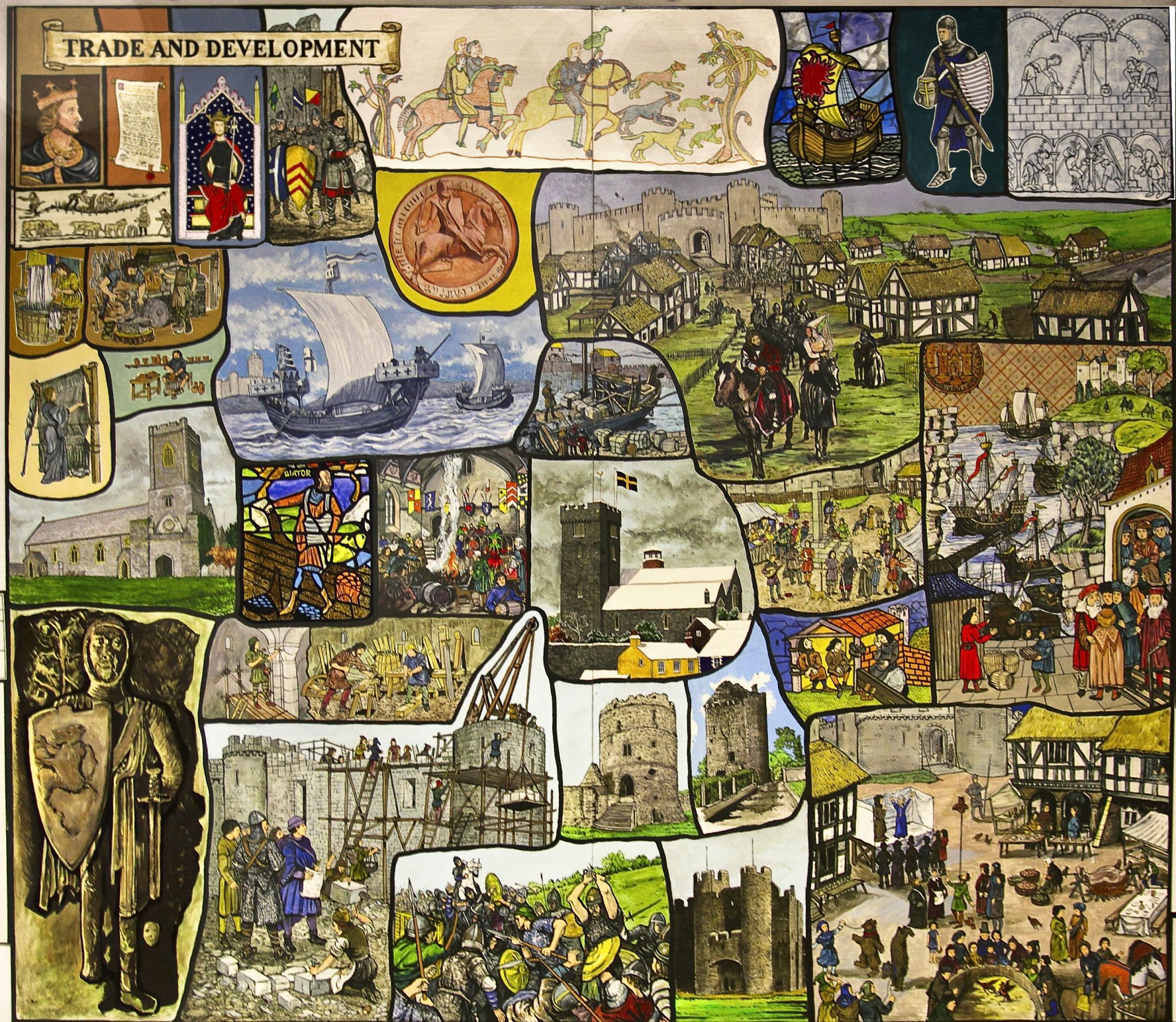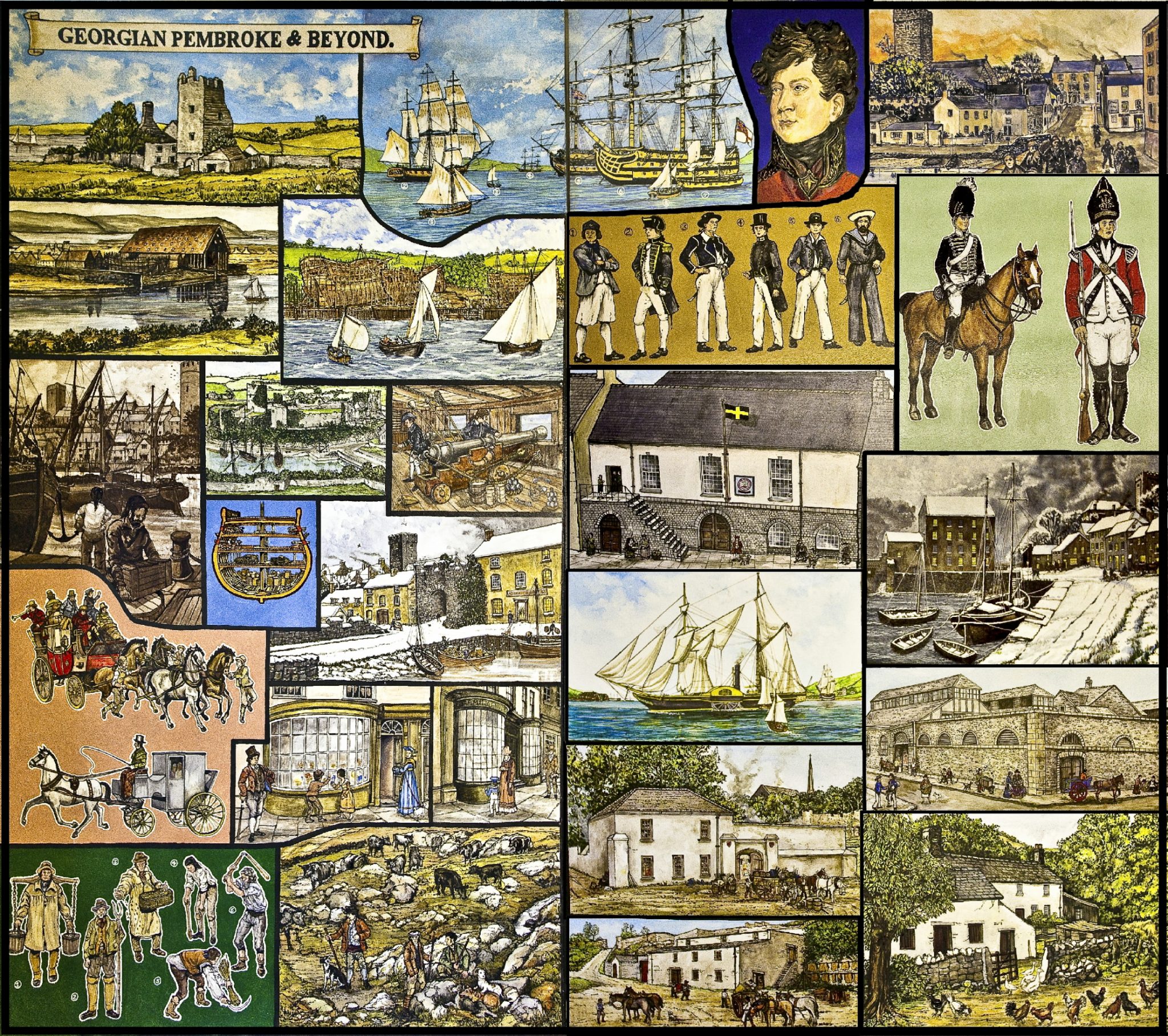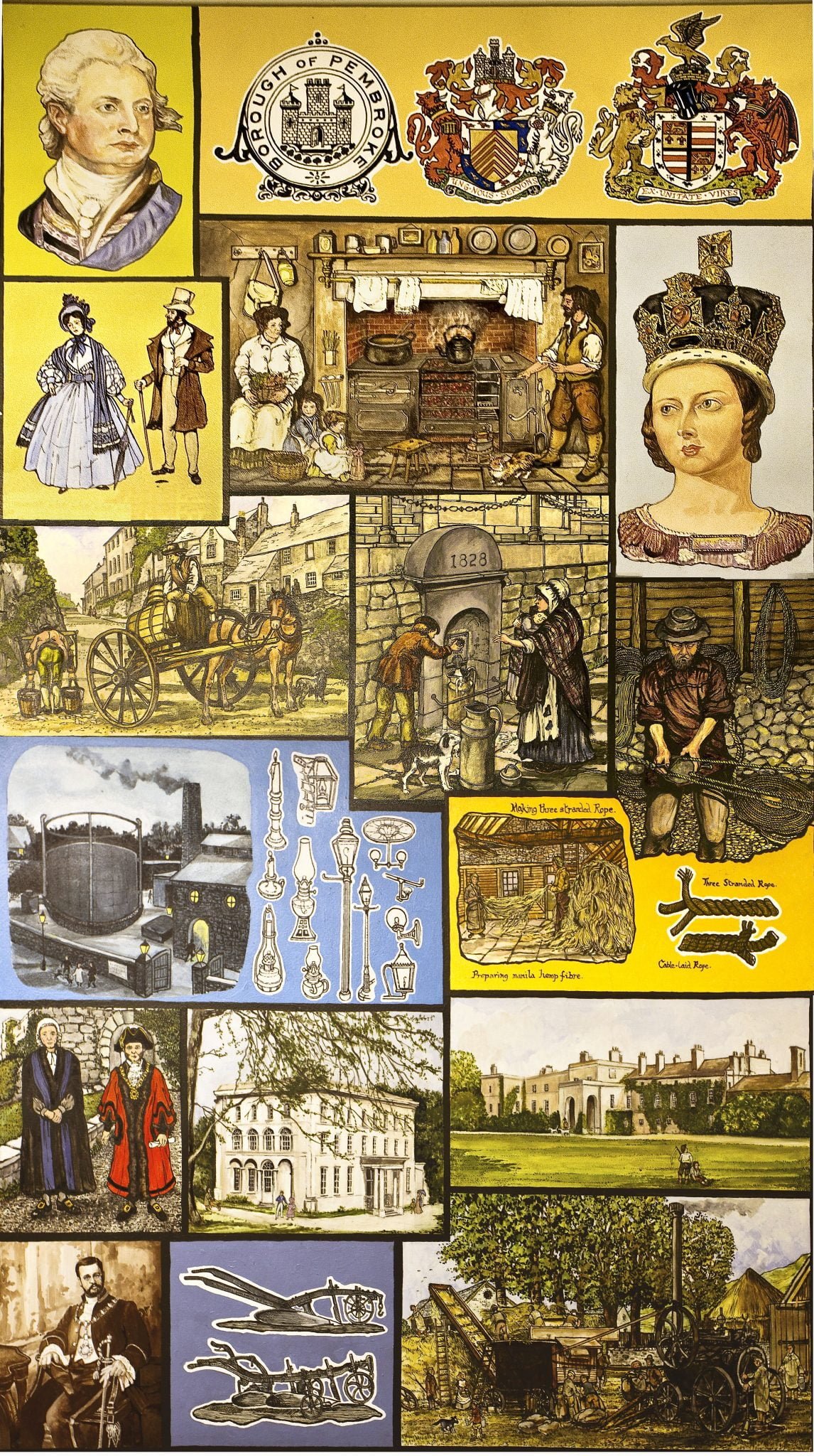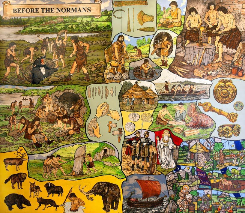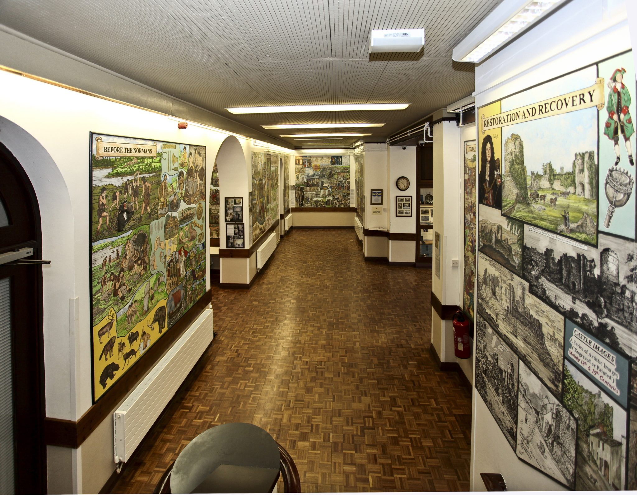 The Murals depict notable events, scenes and people in Pembroke during its development and history from the Stone Age to early 20th Century, are on permanent display in the foyer and upper landing of Pembroke Town Hall.