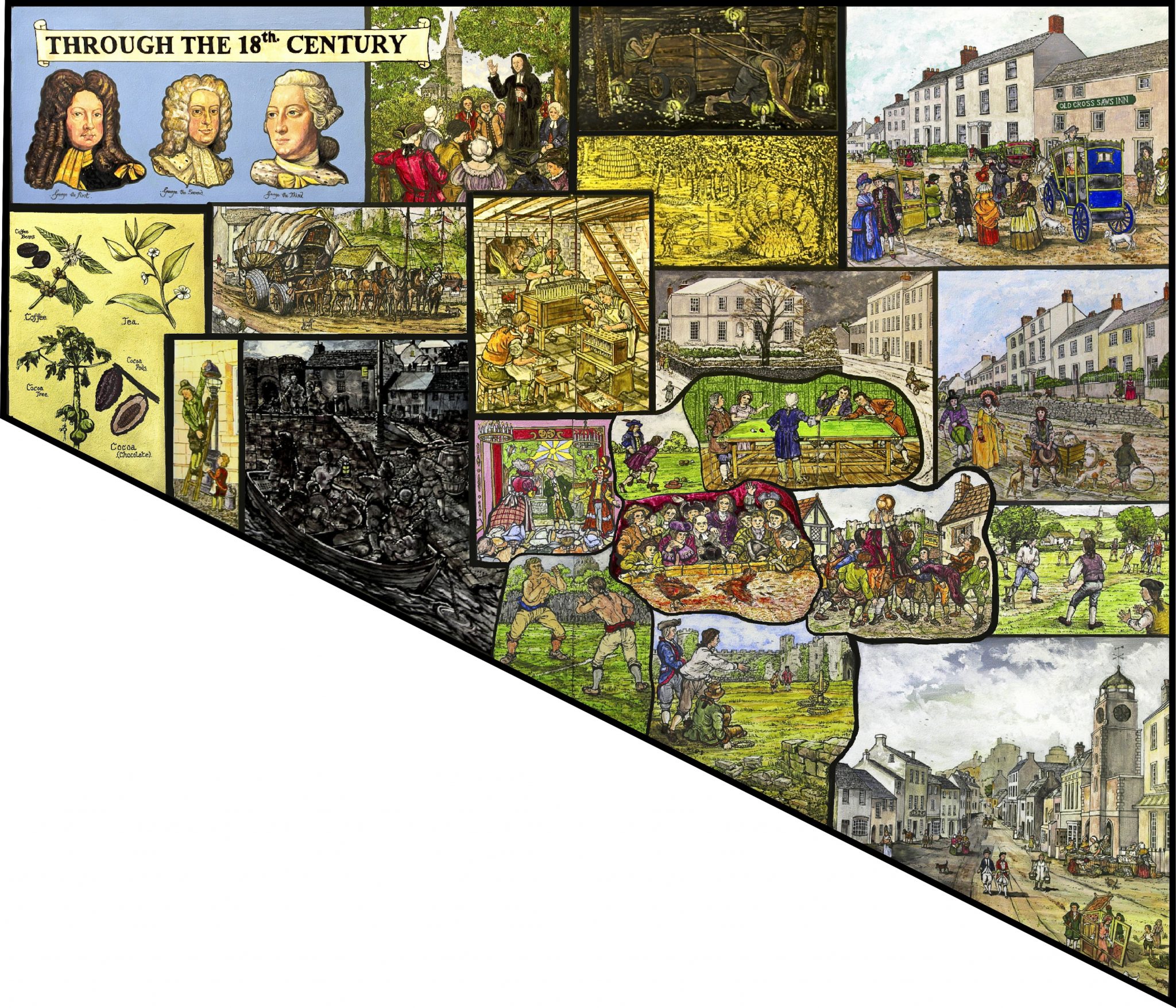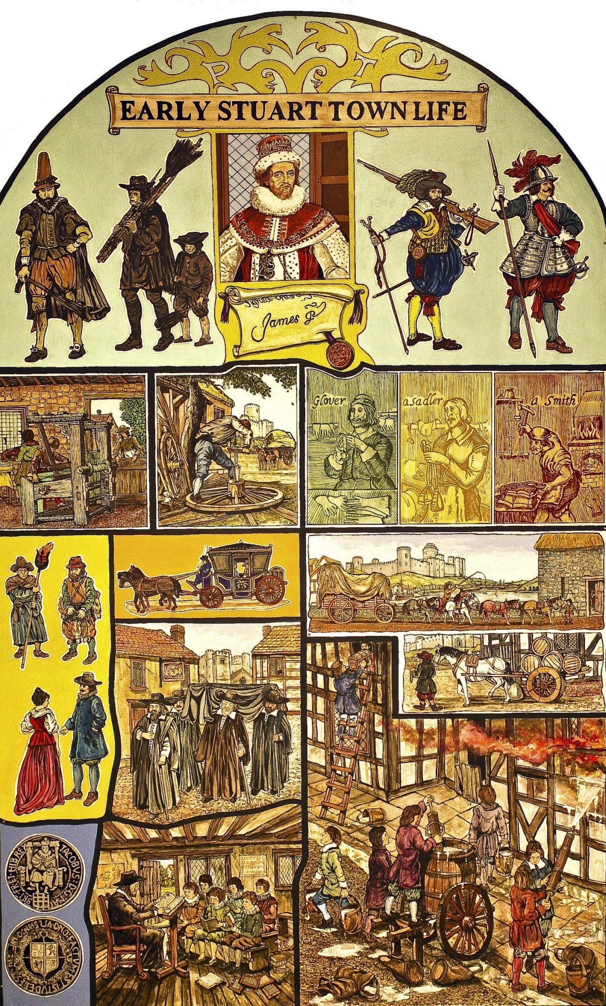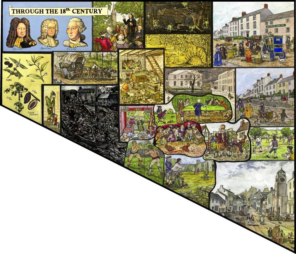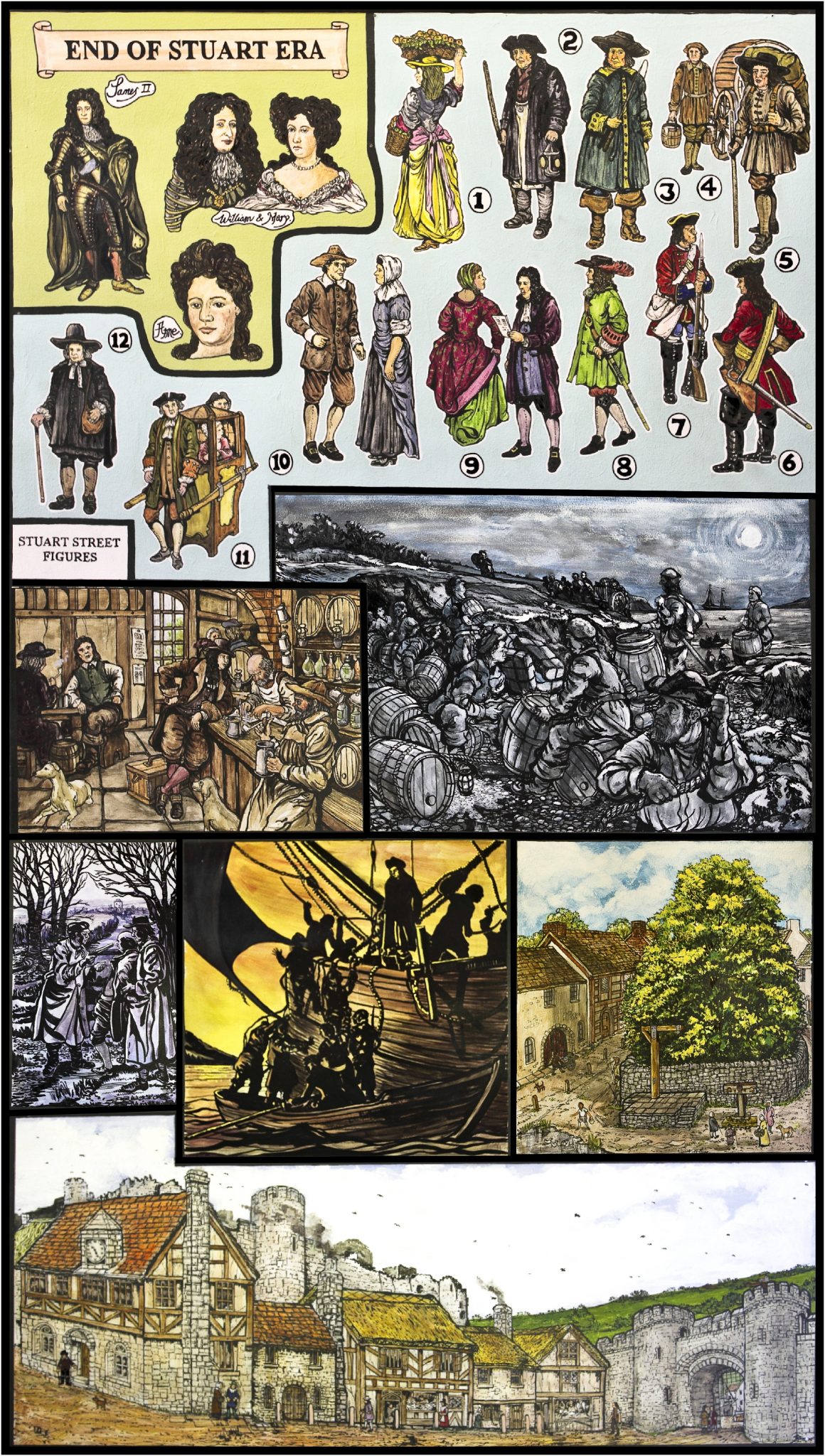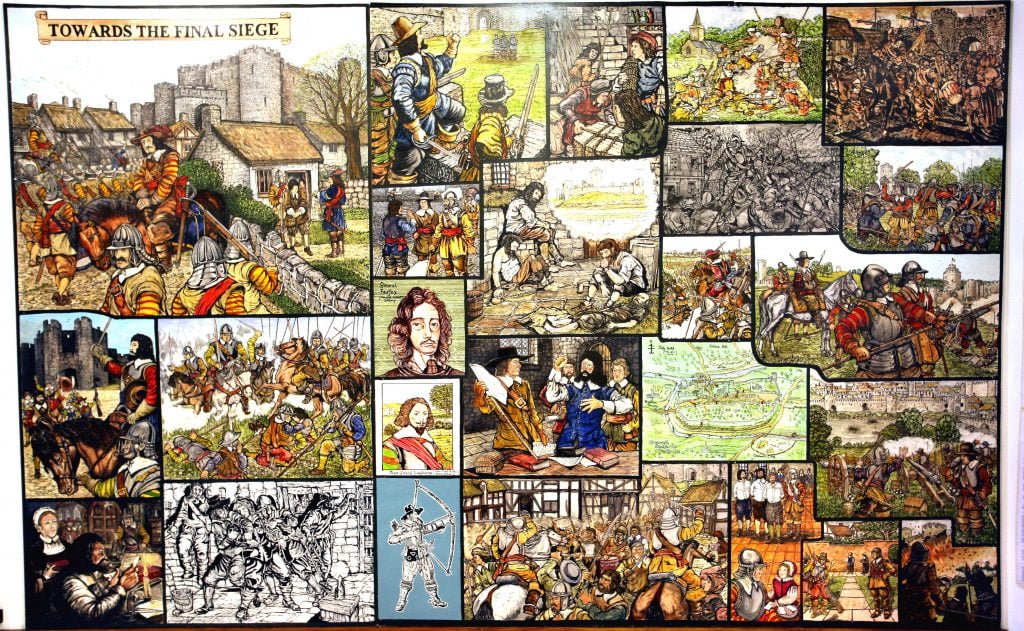 The Murals depict notable events, scenes and people in Pembroke during its development and history from the Stone Age to early 20th Century, are on permanent display in the foyer and upper landing of Pembroke Town Hall.