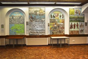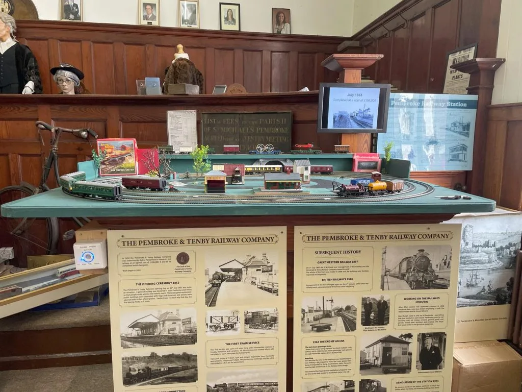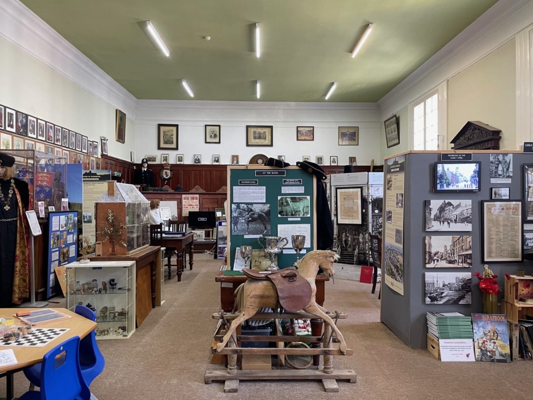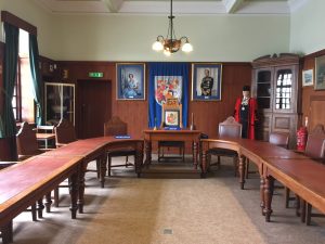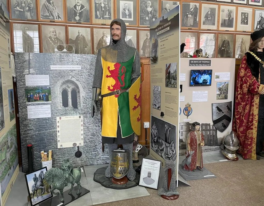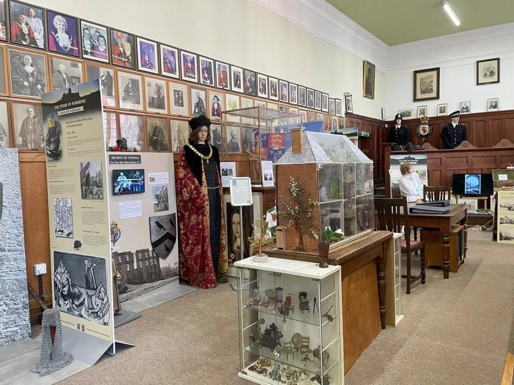 As you enter the Town Hall,  you will see the amazing Pembroke Mural (see below) and you will find the Museum on the first floor (a lift is provided for disabled access).  The Museum occupies the former Magistrate’s Courtroom:  here you can discover the prestigious history of our town, one of the oldest in Wales and famous as the birthplace of the Tudor dynasty. Children are welcome: we have a children’s activity corner. On the first floor also, you can take a look at the Council Chamber, where the Town Council holds its monthly meetings presided over by the Mayor.